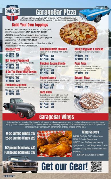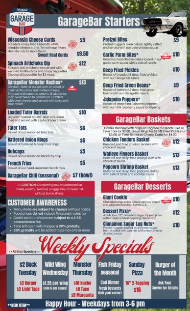 Nestled in the quaint St. Croix Valley community of Woodville, WI, GarageBar serves up a menu of great American beer, food, and music against a retro theme of muscle cars, motorcycles and roadside gas stations. A destination and awesome experience awaits!